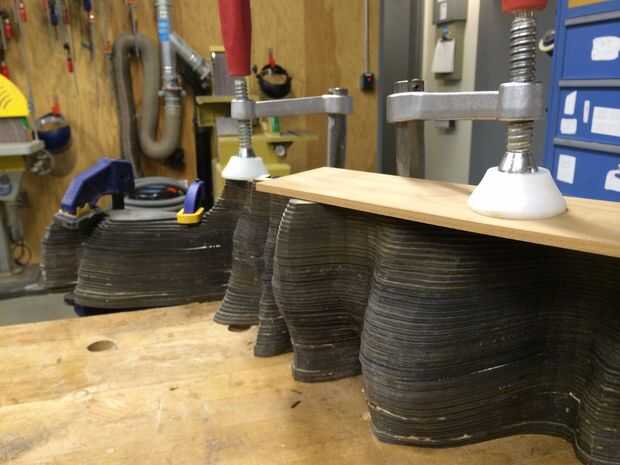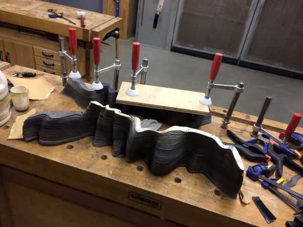 Una gruesa capa uniforme de pegamento se aplican a una superficie, coloque la cara abajo y aplique presión uniforme con abrazaderas. Aplicar la siguiente parte de la chimenea y repita.