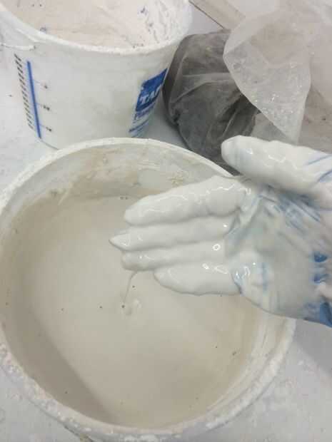 La consistencia de la mezcla de blanco es similar al yogur bebible. Usted quiere ser capaz de mojar la mano y sale blanco. El yeso empieza a calentar y conseguir caliente. No quiere esto verter directamente sobre la piel.
