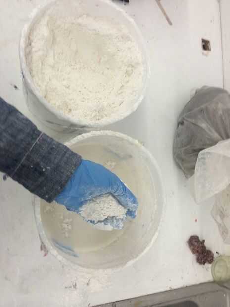 Mezclar con la mano para romper aparte cualquier grupos y asegurar una mezcla uniforme. Una vez que empiezas a mezclar el yeso el reloj está encendido! Su tiempo de trabajo es apx de 10 min antes de catalizar y yeso.