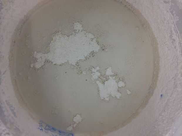 Comience lentamente tamizar puñados de polvo de yeso en el agua, permitiendo que el yeso a hundirse hasta el fondo sin mezclar. Continuar hacerlo poco a poco hasta que vea lo que se conoce como el efecto "seco lecho del lago" (ver foto).