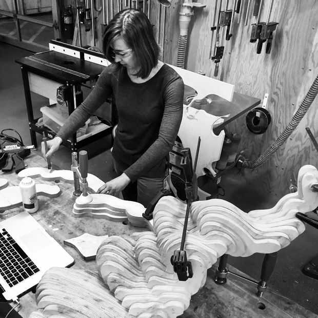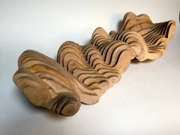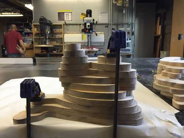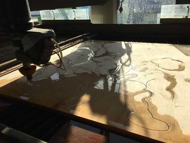Todos mientras trabajaba en estos moldes, decidí usar el chorro de agua OMAX rápidamente cortar piezas nuevas para una nueva iteración en la misma forma, hecha de madera de la capa. Esta vez utilizando madera contrachapada de 3/4" manzana densa y jugar más con las direcciones de la rebanada y explotando la naturaleza estriada de este material