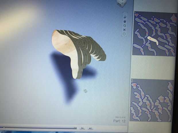 Consulte el paso 3 para las instrucciones de pegado y montaje. Porque el chorro de agua no podía distinguir entre el corte y grabado líneas (parte números etc.) elimina todo lo que datos y conectado mis piezas en los patrones de corte (ver foto 3) para numerarlos afte se cortaron. Seguí mis pasos de montaje 123D muy de cerca para esto del pegamento hacia arriba.