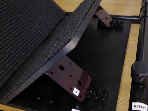 Tomar una de las ayudas de libro y dan la vuelta, por lo que el lado negro hacia abajo. Tornillo de dos de los soportes de esquina de acero en la parte posterior de la ayuda del libro, cerca del borde frontal y cerca del borde posterior de la placa de soporte del libro.