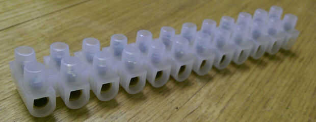 Primero retire todos los tornillos de los terminales y accesorios de latón para que sólo te quedan con una longitud de moldeo de plástico. Corte dos pedazos de choc bloque cada uno unos 10 cm de largo.