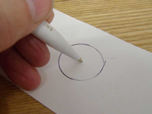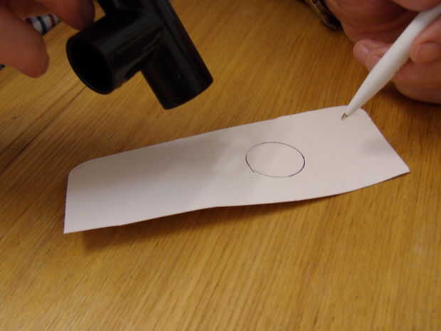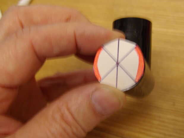 Recorta el círculo y pegarlo en el extremo de la barra transversal, utilizando cinta adhesiva. Alinee la línea restante con la pierna de la t como ves en la imagen.