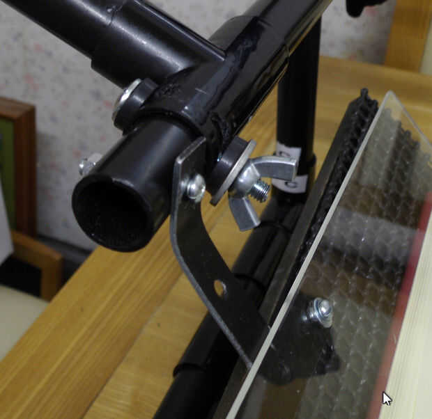 Pero después de que usted es todo para arriba y las cámaras estén posicionadas correctamente, como una última etapa de montaje de la barra de soporte de cámara, necesitará haga u agujero horizontal a través del orificio de forma oval en la camiseta y por el otro lado y usar arandelas de goma y una tuerca de mariposa para sostener firmemente en posición, como se muestra en la segunda foto