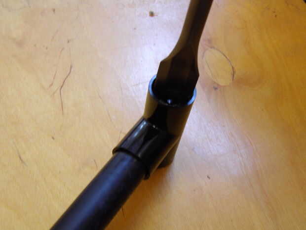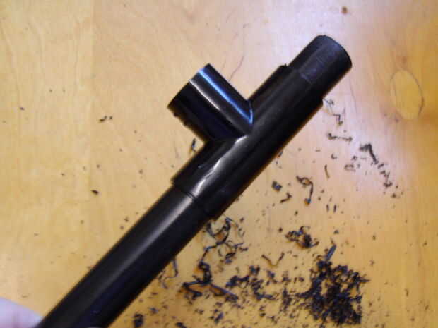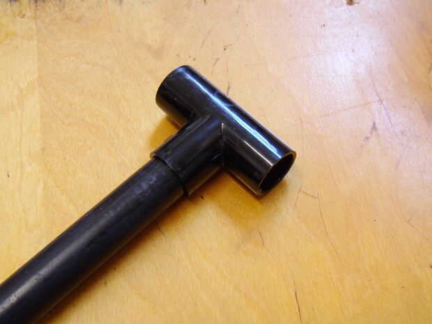 Necesita perforar a través de la barra transversal hasta que esté lo suficientemente abierto como para empujar un tramo de tubería a través de la barra transversal, como se puede ver en la cuarta foto de arriba. La t debe ser un ajuste muy apretado, pero lo suficientemente suelta para que se puede encender el tubo pasa a través de él.