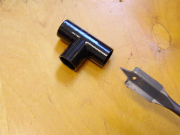 Tendrá que perfore las barras transversales de tres de los Tees para que puede deslizar en un tramo de tubería. Usé una broca de pala plana para ello. Antes de perforar a través de la barra transversal empujó una longitud del tubo de desecho en el tramo restante de la t (ver figura 2) para que pudiera sostenerlo mientras estaba de perforación.