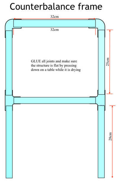 Repita el proceso usando los dos Tees, el tubo de la barra transversal y los otros dos tubos. Antes de pegar, montar la parte superior y la parte inferior como una sola unidad. Asegúrese de que los tubos de la sección superior calcen bien en las dos camisetas. Después de pegar la prensa toda del bastidor de contrapeso contra una tabla para asegurar que es todo plano y todo es recto y verdadero. Otra vez, manténgalo ahí durante unos 10 segundos hasta que el pegamento ha fijado.