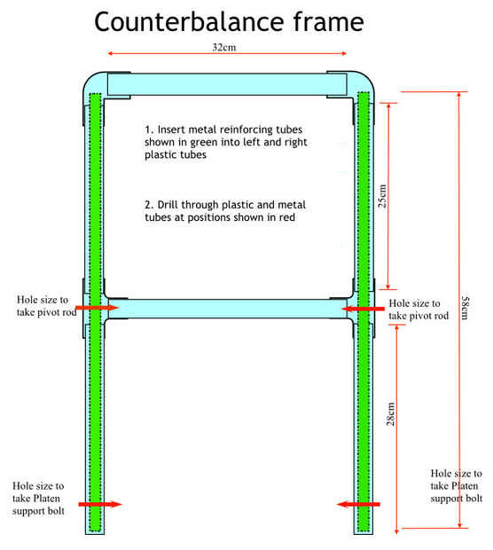 Este tubo de acero es muy ligero, hecho de un acero fino. La razón por la que he insertado estos tubos metálicos es evitar que el marco del contrapeso de la comba en los extremos cuando se carga con el peso del contrapeso en el fondo y las cámaras y la platina en la parte delantera. Sin embargo, si utiliza un tubo de plástico de diámetro ligeramente más grande, (en vez de 21,5 mm tubo que utiliza), puede haber rigidez suficiente en el tubo de plástico para evitar la flacidez sin este refuerzo de acero, por lo que puede salir hacia fuera.