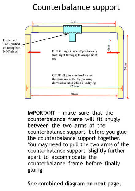 A continuación perfore ambas piernas de la ayuda del contrapeso. Taladro desde el interior y sólo perforar una capa del tubo plástico. No perfore a través. La broca debe ser del mismo diámetro que la varilla de pivote de acero. Ver el diagrama de arriba.