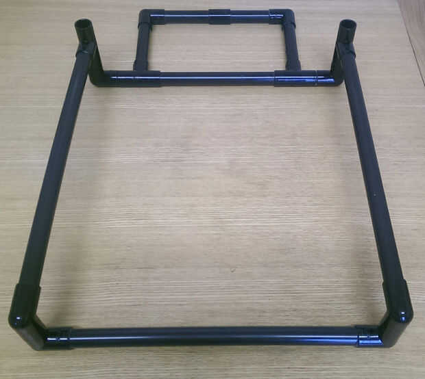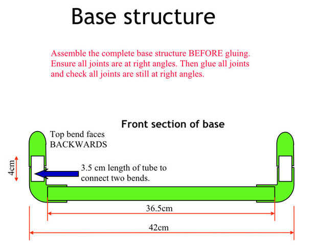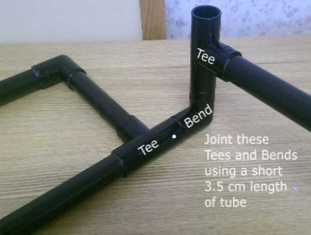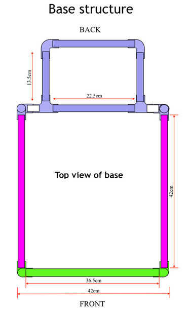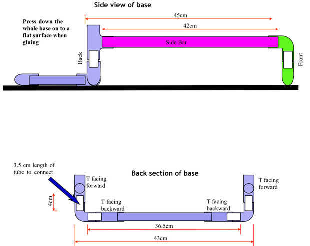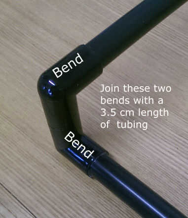 La estructura base es fácil de hacer. Además de los tubos más largos, se necesitará seis pequeños tramos de tubo de unos 3,5 cm de largo. Dos de ellos son para conectarse entre sí las curvas en la parte delantera, y los otros cuatro conectan el tes de las curvas en la parte posterior. Estos pequeños tramos de tubo se muestran en blanco en los diagramas anteriores.