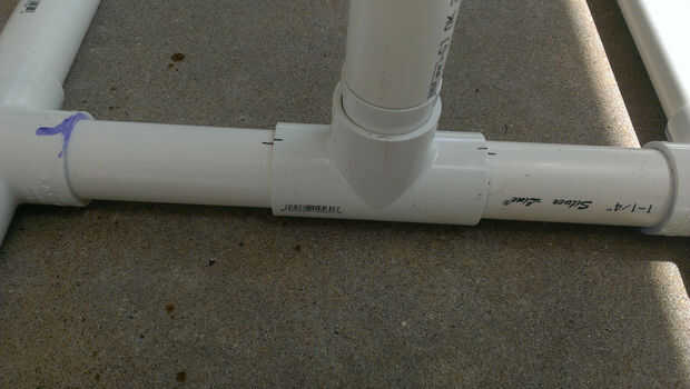 10. Primer y cemento el centro base de conector "T" a 6" piezas de tubo de PVC, asegurar sus líneas de partido.