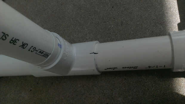 8. Marca de ambos lados del centro de la basan conector "T" y el adyacente 6" piezas de tubo de PVC para que pueda todo la línea de copia de seguridad después de desarmarla.