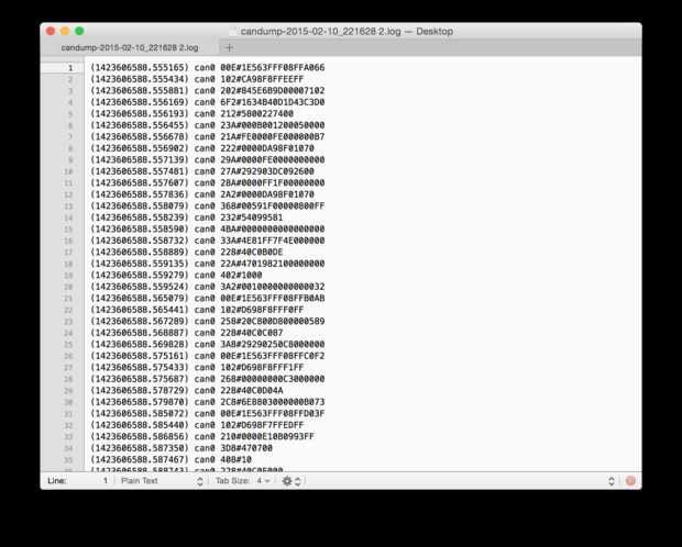 Esto registrará todos los datos a un archivo en su directorio de trabajo actual, con un nombre que parece algo como este de registro candump-2015-02-10_221628 2