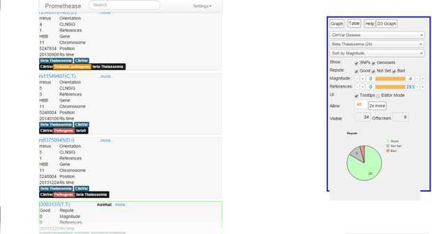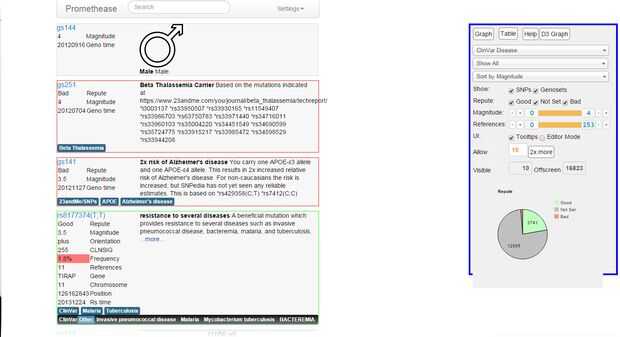 Mezcladas con los alelos lo contrario clínicamente irrelevante * encontrará clínicamente relevantes alelos. Su relevancia clínica es empíricamente confirmada (via ClinVar) o inferir; Esta distinción es importante porque lleva consigo el beneficio añadido de pruebas bien investigado. Dará cuenta de que en la imagen arriba, aparece después de mi género, son dos alelos asociados negativamente y un alelo positivamente asociado con magnitudes 3.5 +. Usted también notará que el alelo «bueno», una mutación rara en TIRAP que confiere resistencia a las enfermedades alterando la forma de señal de mis células para antígenos invasores, es en ClinVar pero no es mi estado de portador de beta talasemia. Mientras no todos los SNPs que tienen un componente clínico bien validado en ClinVar, basta hacer clic en la beta-talasemia "genoset" para ver el SNP individual, uno de los cuales es el SNP específico haciendo que mi estado de portador de talasemia beta (rs11549407) y en ClinVar.