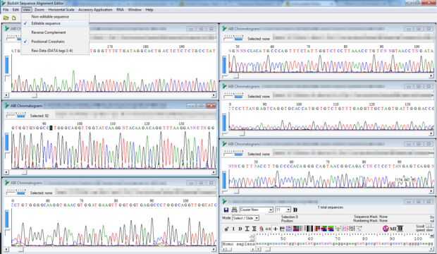Una vez que usted carga sus cromatogramas querrá editar las secuencias para asegurarse de que el programa automatizado hecho las llamadas derecho base haciendo clic sobre la secuencia editable (segunda foto). Una vez que tengas todas las secuencias editadas puede alinear a su secuencia de conexión y resolver cualquier discrepancia o verificar nucleótidos heterozigóticos. También puede preparar la secuencia de referencia mostrando características (tercera y cuarta imagen) para que usted pueda ver los polimorfismos (variaciones, Quinta imagen) en la secuencia y, después de alinear, a ver si tu muestra tiene cualquier polimorfismos.