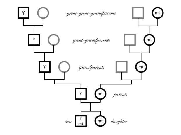 Todo el mundo vivo hoy (que puede cambiar con el advenimiento de la Fecundación in vitro de tres padres para corregir enfermedades mitocondriales, ver informe adicional por Amato et al 2014) es genéticamente un poco más su madre que el padre; incluso más-así que si son masculinos (cuantitativamente). Esto es porque nosotros heredamos nuestro ADN mitocondrial de nuestra madre a través del óvulo. Utilizando este hecho y el hecho de que los hombres reciben su cromosoma de y de sus padres, podemos hacer un interesante análisis de linaje.