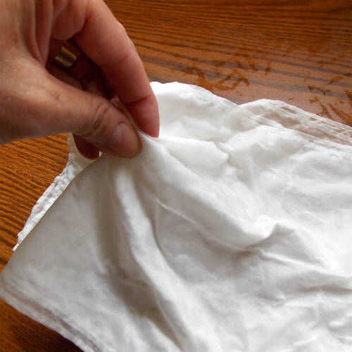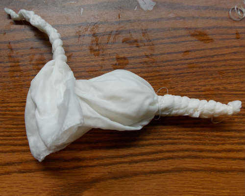Tome el pañuelo fuera del baño de vinagre y apretón hacia fuera exceso de líquido. Ahora, doblar por la mitad a lo largo y luego doblarlo otra vez. Tire hacia arriba de una zona al azar de la bufanda (todas las 4 capas) y atar firmemente la cadena alrededor de él de manera espiral. Repetir en uno o dos puntos más, dependiendo del tamaño de la seda.