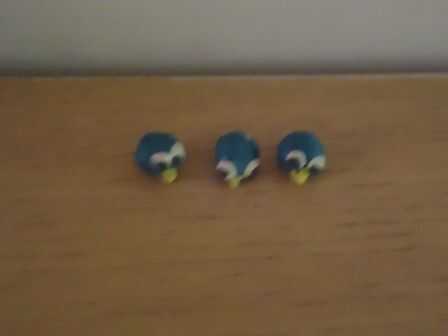 3 bolitas de arcilla azul, 3 pequeños triángulos amarillos para la boca, los ojos están hechos de un pedazo de blanco luego un pedazo más pequeño de color negro sobre él y pégalos en las bolas azules :D