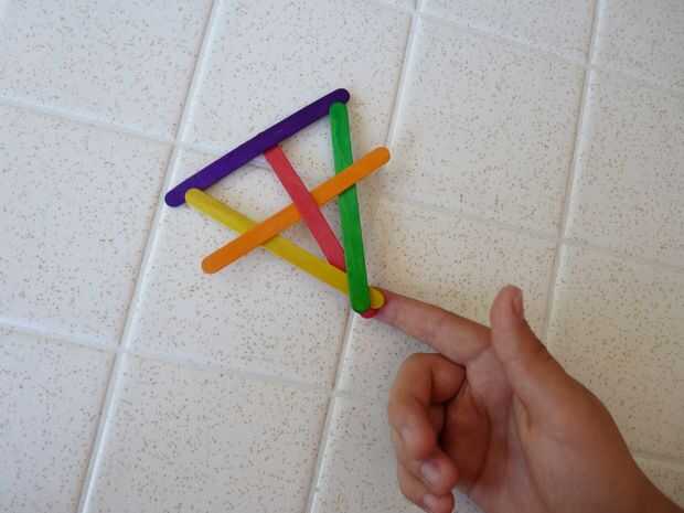 Mantenga el palillo pasado (púrpura) como cerca del cierre en los extremos de los palos perpendiculares 3 como sea posible. Incluso puede colgar los bordes mientras todavía están sosteniendo. El más cercano a los bordes, pendía más la acción.