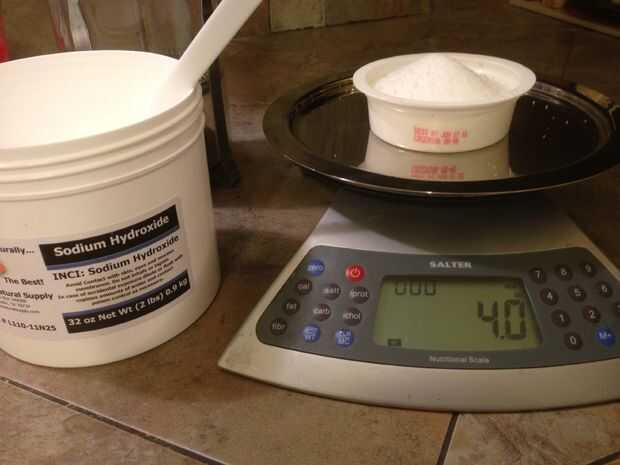 Utilizando una escala de buena calidad, cuidadosamente mida 4 onzas hidróxido de sodio en un recipiente no reactivo con un utensilio no reactiva.