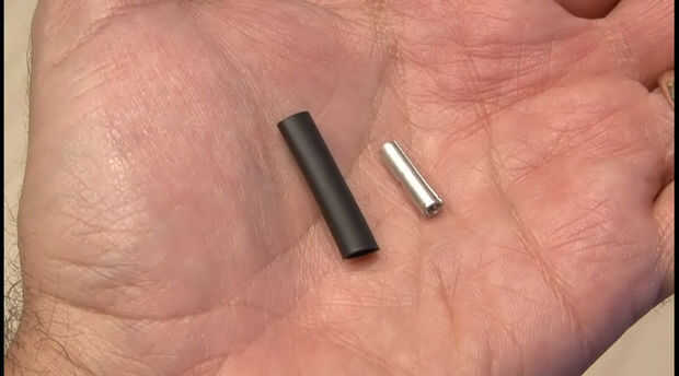 3. Pele los dos cables y acople un conector de espada a una y después de deslizarse sobre una pequeña pieza de calor tubería del encogimiento, coloque un calibre de 12-14 Conector de tope (Radio Shack) a otro.