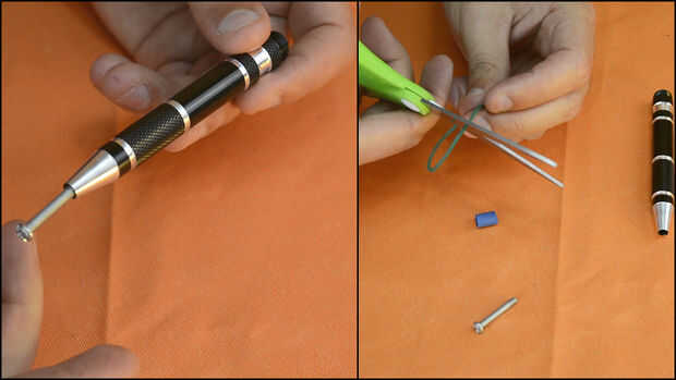 Después de quitar el clip, corte una banda elástica por la mitad y lo ató a un tornillo.