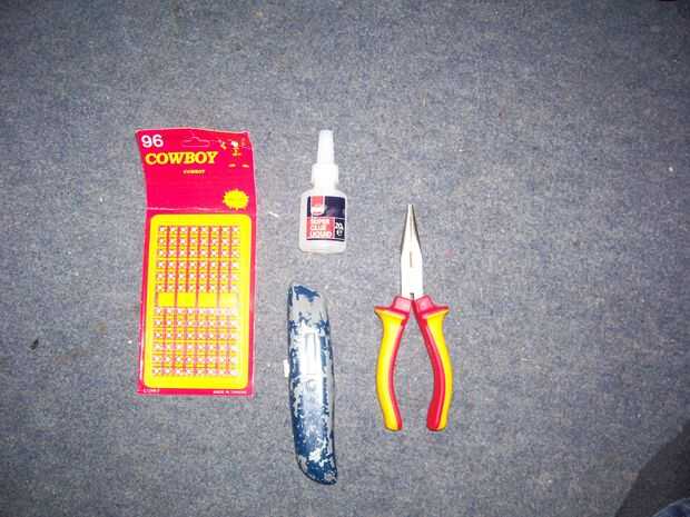 Algunos Caps, estas se venden en más tiendas de juguete y también están disponibles en línea... Si vives en el Reino Unido, que ahora se clasifican como "fuegos artificiales" y no pueden ser vendidos a cualquier persona menores de 18 años (sé que su patético...) están disponibles en muchos anillos de tipos 8 y 12 tiros de revólveres, los rodillos de 100 cápsulas de papel para el relé antiguo estilo guns... y tiras de 10 estas son tapas individuales y deberán estar separadas de la malla, pero trabajo bien para este propósito.