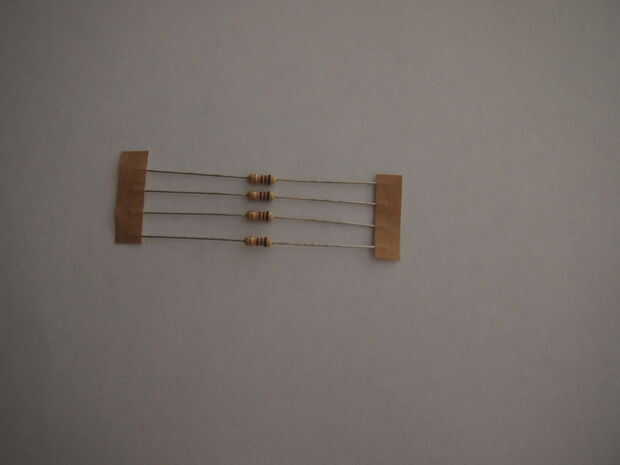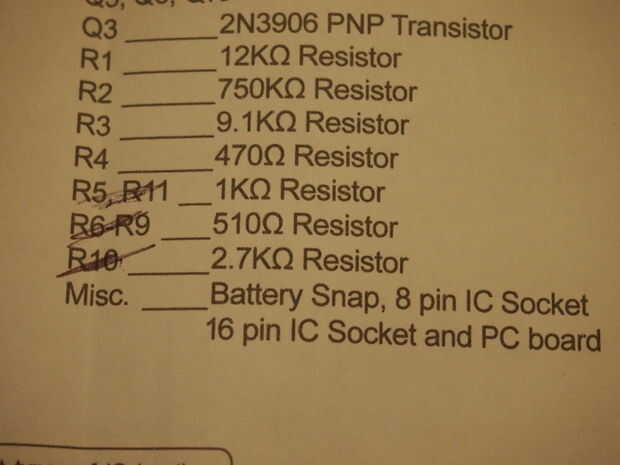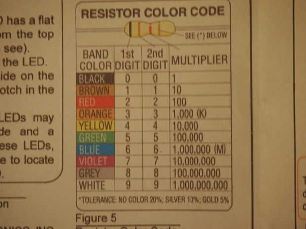 Resistencias de 6-9 son todos 510 ohmios. Para determinar que resistencia es que, consulte la figura 5, que también cotiza por encima de. Los dos primeros colores de cada resistencia se asignan a un número específico. El número de dos dígitos corresponde a una resistencia que aparece en la figura 2, que se muestra arriba. La magnitud del número puede ser diferente debido al valor del multiplicador, pero los números se deben coincidir. Los dos primeros colores de resistencias de 6-9 son de color verdes y marrón. No te preocupes polaridad con resistencias.