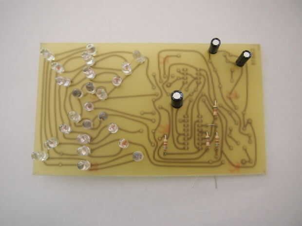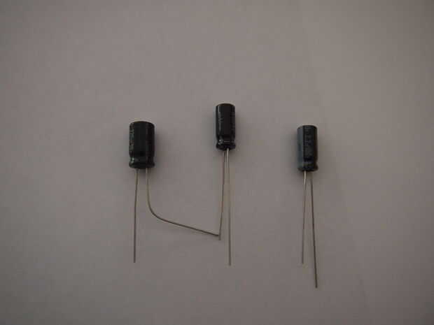 El más delgados dos capacitores (C1 y C2) son 2,2 uF. El más gordo (C4) es 220 uF. Para determinar donde estos se ubican, consulte figura uno. Estos condensadores son polares. El lado negativo está marcado con una franja gris, gruesa en el lado del condensador. El lado negativo también se etiqueta en la figura uno, así que asegúrate que emparejan para arriba y las patas de los condensadores van en los orificios derecha.