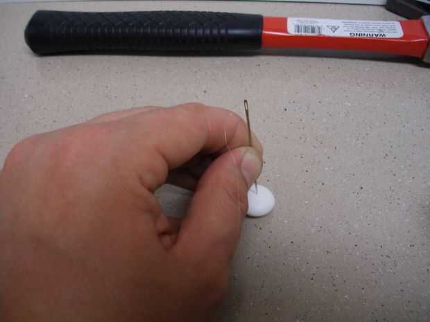 -Cuidadosamente mantenga la aguja en el centro de un solo Mento y martillo suavemente hasta que perfore a través del centro al otro lado. Esta parte puede ser un poco irritante como los Mentos tienden a dividir por la mitad. Si te encuentras estresarse y agotando en Mentos entonces podría también utilizar un poco de cinta y simplemente cinta adhesiva un extremo del hilo a la Mento y saltar todo el asunto con la aguja. Sólo utilizo la aguja ya que asegura una sujeción segura en la Mentos.