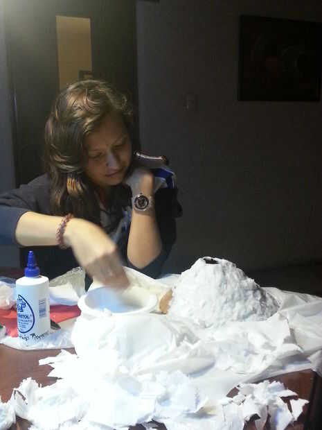 Colocar un trozo de cartón y colocar un contenedor en el centro. En el recipiente se mezcla la "lava" y será la base de su volcán. Puede moldear arcilla desde la base hasta la cima de la can. En nuestro caso, nuestro pequeño volcán fue hecha de una mezcla de agua y pegamento líquido y papel suave como papel higiénico o kleenex.
