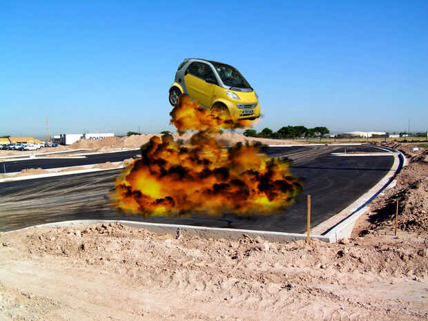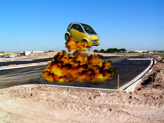Me pareció que el coche parecía un poco fuera de lugar. También descubrí que parecía que la explosión no parecía como si fuera bajo el coche elegante. Para solucionarlo repitió el proceso para hacer una explosión (capas de naranja y amarillas negro) debajo del coche inteligente. No necesita exportar y todo eso si apenas estás añadiendo algunos retoques.