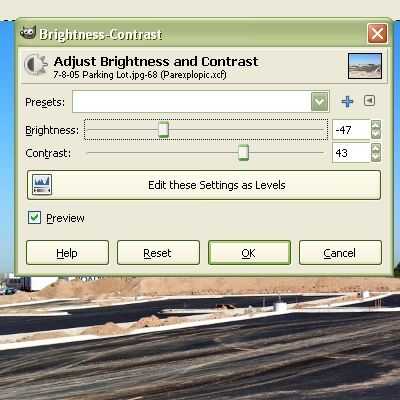 La cosa de lo que tienes que hacer en este paso es cambiar el brillo y el contraste. Olvidé como llegar, no puedo abrir GIMP en este punto. Una vez que abra la ventana de diálogo, el contraste y bajar el brillo. He utilizado brillo de -47 y 43. Os animo a utilizar diferentes ajustes y experimentar con ellos (después de al menos recorren a través del explosión todo proceso al menos una vez)