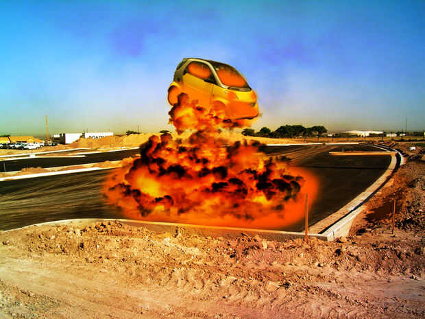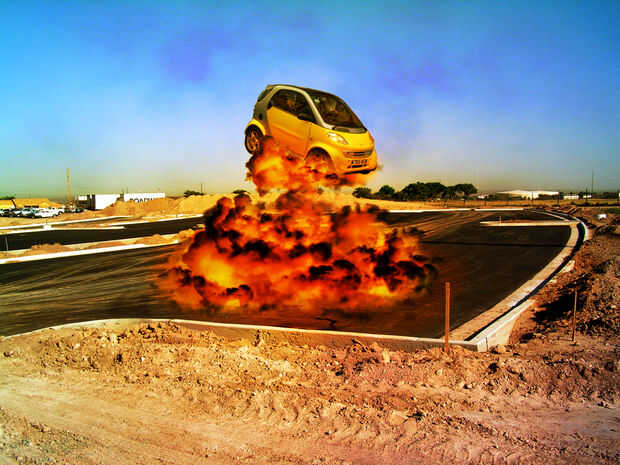 Ahora el primer plano a la misma naranja que he estado trabajando con y agarra un pincel grande. Todo lo que necesitas hacer es color en los lugares que parecen como se vería anaranjado de la explosión. (Mirar la foto para más info) Pinté el suelo debajo y alrededor de la naranja de la explosión, así como la sección inferior del coche smart junto a las ventanas. A no dejarse llevar. Establecer la capa de recubrimiento al 100%. Si encuentras algunas secciones para poder naranja, borrarlo y ponerlo en una nueva capa. Establecer superponer pero esta vez baja la opacidad hasta que satisficiera.