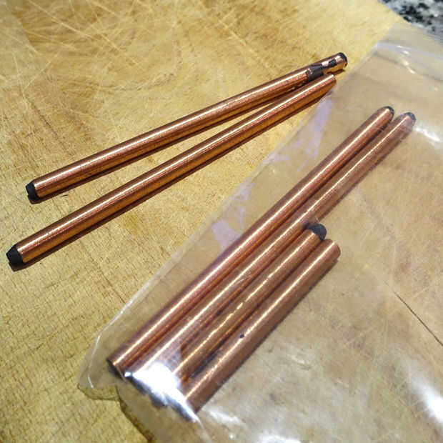Usted también necesitará encontrar un par de electrodos adecuados para conducir la corriente en el agua. Idealmente, estos deben tener una superficie no reactiva como grafito. O platino, si te sientes elegante. Raspó la capa de cobre de un par de grafito soldadura electrodos para producir dos varillas de carbón inanimado. Unos plomos de lápiz agrupadas también haría el truco.