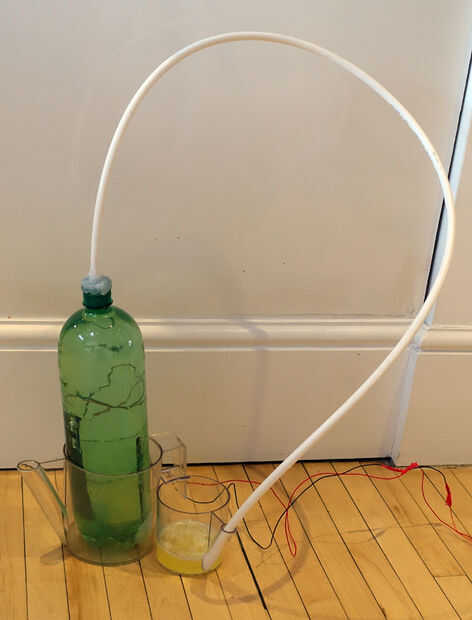 Llene la botella con agua, enroscar firmemente la tapa y compruebe que no haya pérdidas. Ahora intento enganchar hasta la fuente de poder y sumerge el extremo libre del tubo plástico en una taza de agua y jabón. Pronto verá formando burbujas. Si toca a un partido a estas burbujas (manteniendo la llama lejos de la botella sellada de gas inflamable!), que deben explotar deliciosamente.