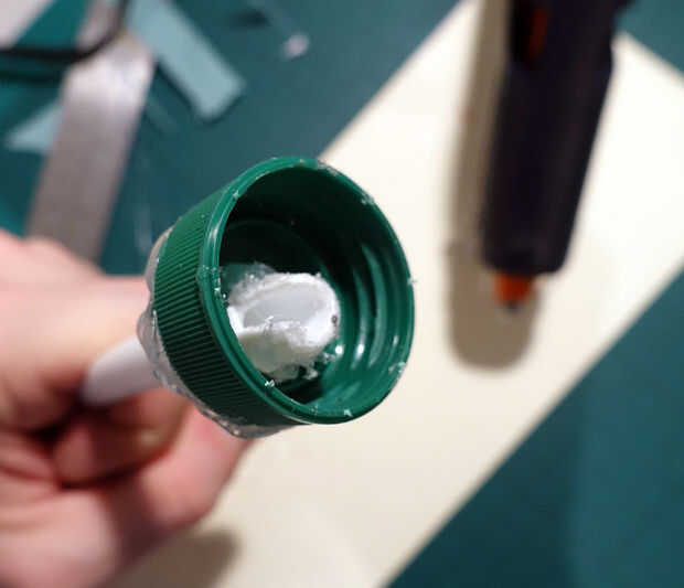 Perfore un agujero a través de la tapa de la botella, inserte un tubo de plástico flexible y volver loco con el pegamento caliente.