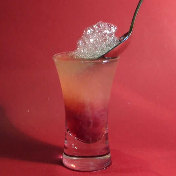 Después de unos minutos, debe haber acumulado un considerable grupo de burbujas de clara de huevo y gases explosivos. Cuidadosamente de la cuchara les de su contenedor en la superficie de sus cócteles. Asegúrese de limpiar la cuchara cada vez para evitar contaminar su huevo con los ingredientes del cóctel.