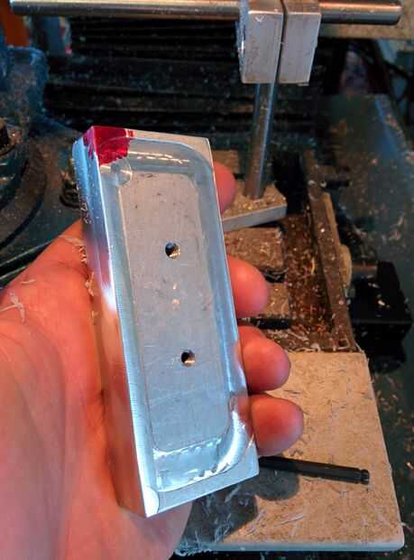 Aquí le damos la luminaria completa. Un 5/8" grueso bloque de aluminio con dos agujeros roscados. Las marcas de herramienta son desde el primer momento se utilizó el aparato y cortar solo un poquito profundo.