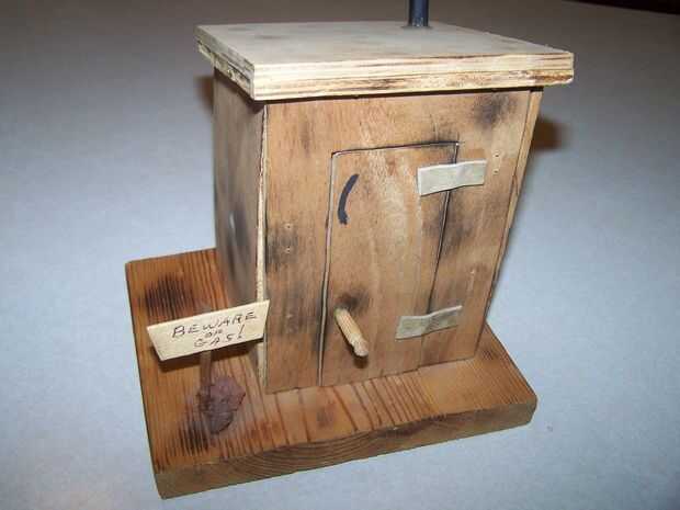 Paso 11: Monte letrina. Set ratón trampa entonces soporte laterales con panel frontal, pie panel posterior entre los paneles laterales. Ver arriba foto de juego de trampa y lados. Conjunto superior (azotea) sobre los lados.