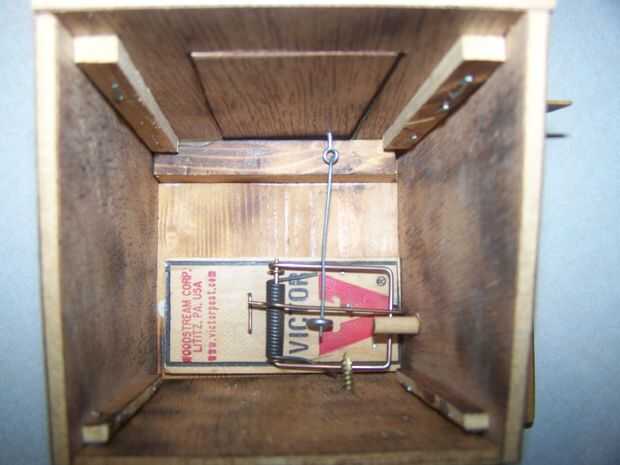 Paso 6: Pegamento había acabado frontal a base de 1/2" espesor de 6" x 6". 3/4 del lado derecho y 1 1/4" detrás del borde delantero. Véase la figura 14. Preparación de la trampa del ratón Victor por quitar titular de cebo e instalación tornillo medio ojo en la ubicación que se muestra en la figura 18. Trampa del pegamento del ratón a la base como se muestra en la figura 14. 3 3/4" detrás del frente del panel frontal o 5" detrás del borde delantero de la base. Trampa del ratón del centro en el panel frontal.