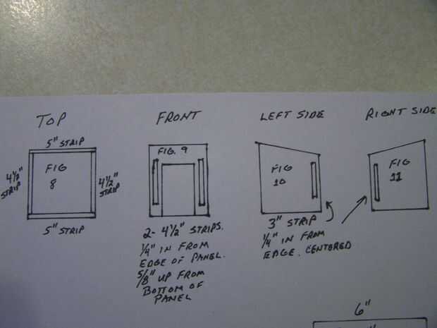 Paso 4: Invierta arriba, frente, lado izquierdo y lado derecho. 1/4 tiras de pegamento en las piezas como se muestra en las figuras 8, 9, 10,11. También, en la parte inferior del panel frontal. Pegamento 1/2 "x 1/2" x 3 3/4" madera contrachapada tira. NO PEGAR A LA PUERTA! SOLO PEGAMENTO EN LOS EXTREMOS EN EL PANEL FRONTAL. Vea la figura 12.