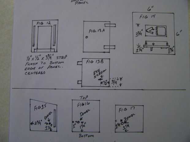 Paso 7: Establecer lado izquierdo, parte superior y parte posterior, en el interior para arriba. Pegamento 1/4" redondo x 1" largo tacos a la espalda y lado izquierdo del panel como se muestra en las figuras 15 y 16. Pegamento 3/8" redondo x 1" espiga larga hacia arriba (techo) como se muestra en la figura 17.
