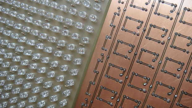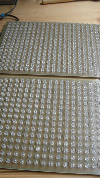 Soy consciente de que probablemente no necesitaba tantos que he utilizado dos tableros, casi A4 en tamaño con cerca de 350 LEDs espaciados uniformemente por tablero. Una tabla se utilizará para la exposición superior y otro para la parte inferior.