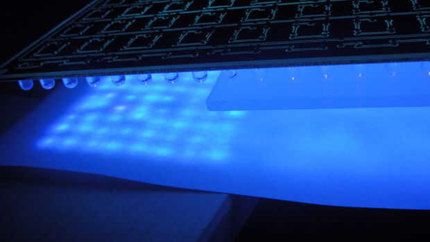 Otro punto es que los leds se centran en un punto, por lo que necesitará mantener los leds bastante lejos de la exposición pcb (cerca de 12cm). Para hacer más pequeña la distancia y para asegurar una buena, luz, uniformemente difundida utiliza vidrio esmerilado blanco.