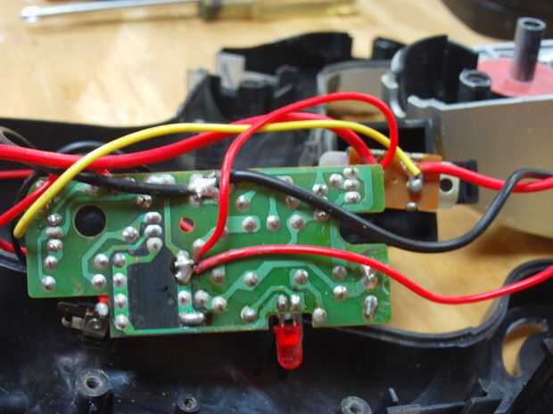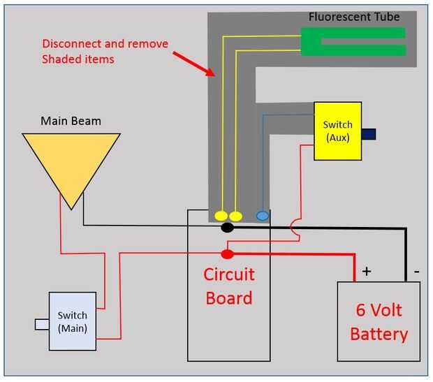 El diagrama muestra qué cables deben ser extirpado. Todos los cables desde la placa de circuito de la lámpara fluorescente y el cable de retorno del interruptor a la tarjeta de circuitos debe ser extirpado. Asegúrese de dejar el cable positivo, el interruptor de alimentación intacto. La última foto muestra la parte posterior de la placa de circuito con el cableado viejo retirado. Dejo la placa de circuito en el centro de atención ya que también contiene la circuitería necesaria para cargar la batería.