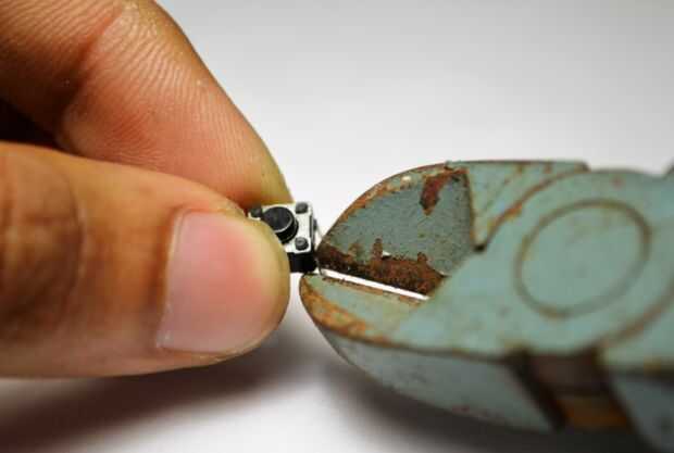 La mayoría de interruptores momentáneos consisten en 4 terminales. En este proyecto vamos a usar sólo dos de ellos haciendo redundantes los otros dos. Después de comprobar los dos terminales que desea utilizar con un multímetro, corte los extra dos terminales usando un cortador de alambre o alicates.