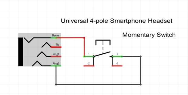 - El otro terminal del botón / momentáneo conmutador está conectado al terminal de MIC(Sleeve) de la toma de audio.
